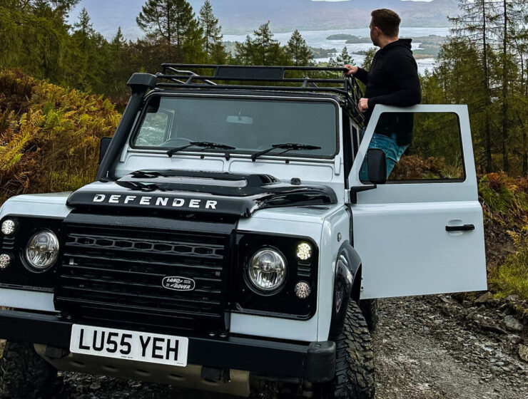 Perched on top a craggy Scottish hill in a white and black Land Rover Defender,…