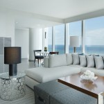 The hotel rooms are sleek and contemporary with stark white walls complimented by handsome wood veneers, tufted fabric headboards and taupe striped carpeting under a plush king or queen-sized bed. Guests have access to the latest technology including a state-of-the-art flat screen TV, music, WiFi, Rheostat lighting, and temperature settings through one remote control. It’s somewhat frivolous, in my opinion, compared to the floor-to-ceiling windows with breathtaking views of the Atlantic Ocean. The baths are ultramodern with mocha veined travertine floors, double sinks, a large walk-in shower and adjustable ambient lighting.