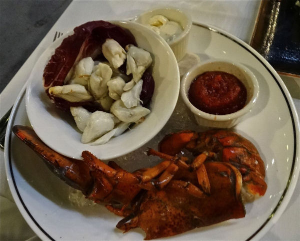 To start with there is nothing better that their fresh Colossal Lump Crabmeat and Lobster (in shell) cocktail with tasty sauces on the side and their mouth watering Clams Casino served with a slab of bacon on each shell. Their Steakhouse Wedge salad served with a dreamy blue cheese dressing and fried onion rings is the perfect segue to the main course. And of course one can not dine at the BV’s Grill without enjoying one of their prime steaks and the NY Strip Sirloin was a great choice — cooked to perfection and served with Bobby Vans Steak Sauce Yum! For those not inclined to eat meat their Horseradish Crusted Salmon was more than satisfying as would be any of their wonderful seafood main courses.