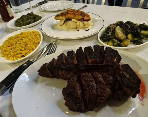 NY Strip Steak & Horseradish Crusted Salmon with sides served at BV’s Grill in The Time Nyack Hotel